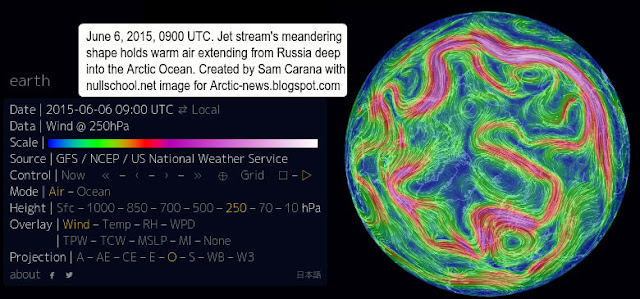 The animation below runs the time of the top image (June 6, 2015, 0900 UTC) to the above image (June 7, 2015, 1200 UTC), showing forecasts of the jet stream moving over the Arctic Ocean, with its meandering shape holding warm air that extends from Russia deep into the Arctic Ocean.